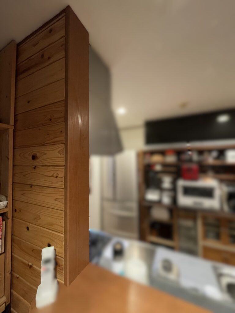 カウンターから天井までを何度か採寸。丸ノコ使って最初は少し長めにカット。キッチンカウンターに合わせてまたカット・・・を繰り返して微調整した。