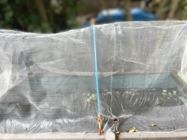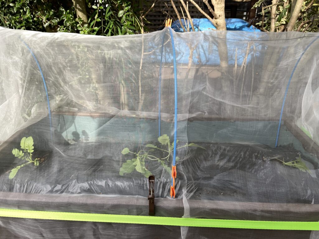 仕切り直して3ケ所に植え直した。 防虫ネットを張って荷造り用のベルトで固定した。
