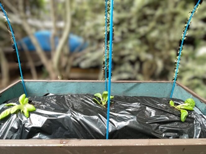 そんな時、NHK「やさいの時間」でプランター防虫ネットの張り方を学んだので、荷造り用ベルトで固定することに。