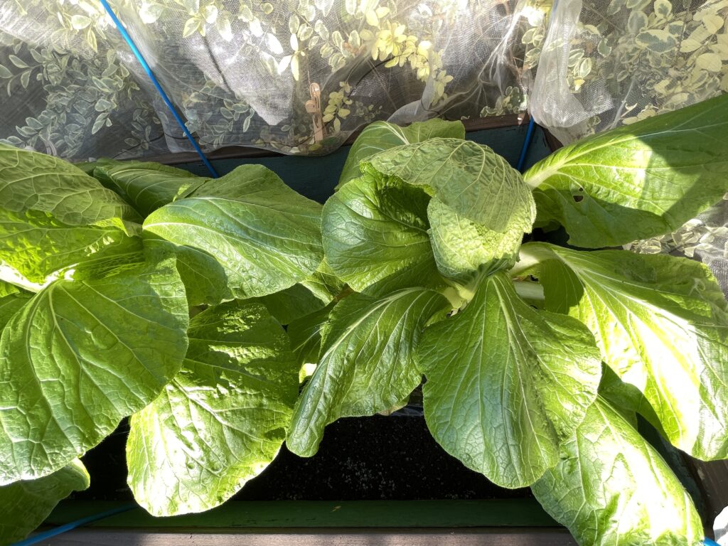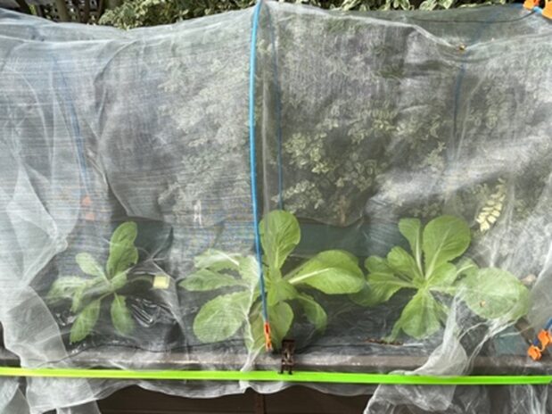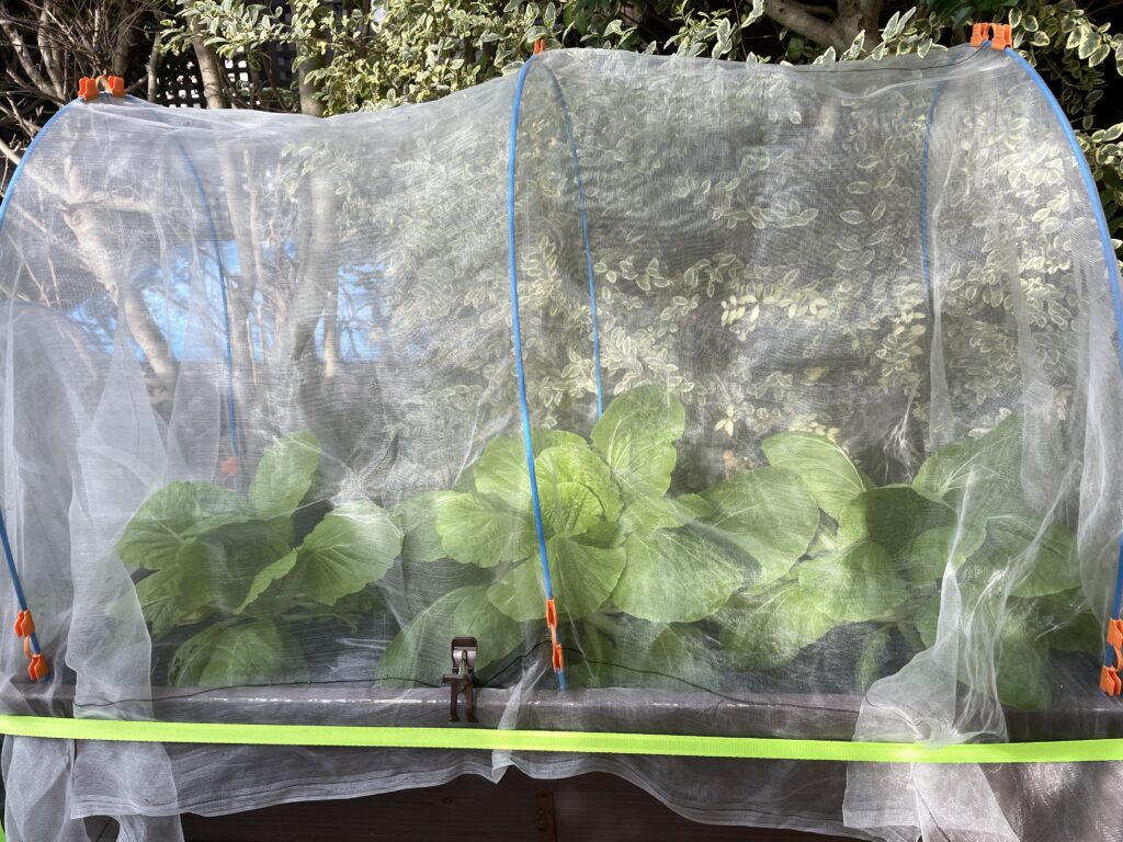 ホームセンターで購入した苗を3株植えました。防虫ネット張って麻ヒモで固定しました。