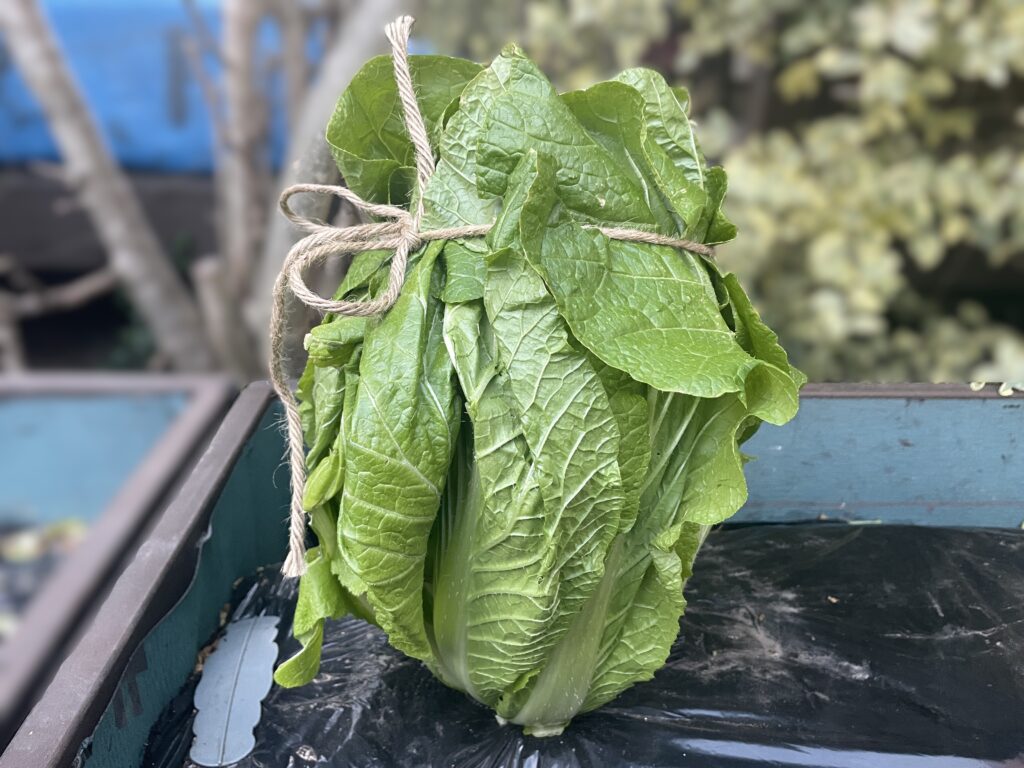 だいぶ寒くなってきたので、寒さから守るために外葉を丸めて麻ヒモで仮留めをしました。