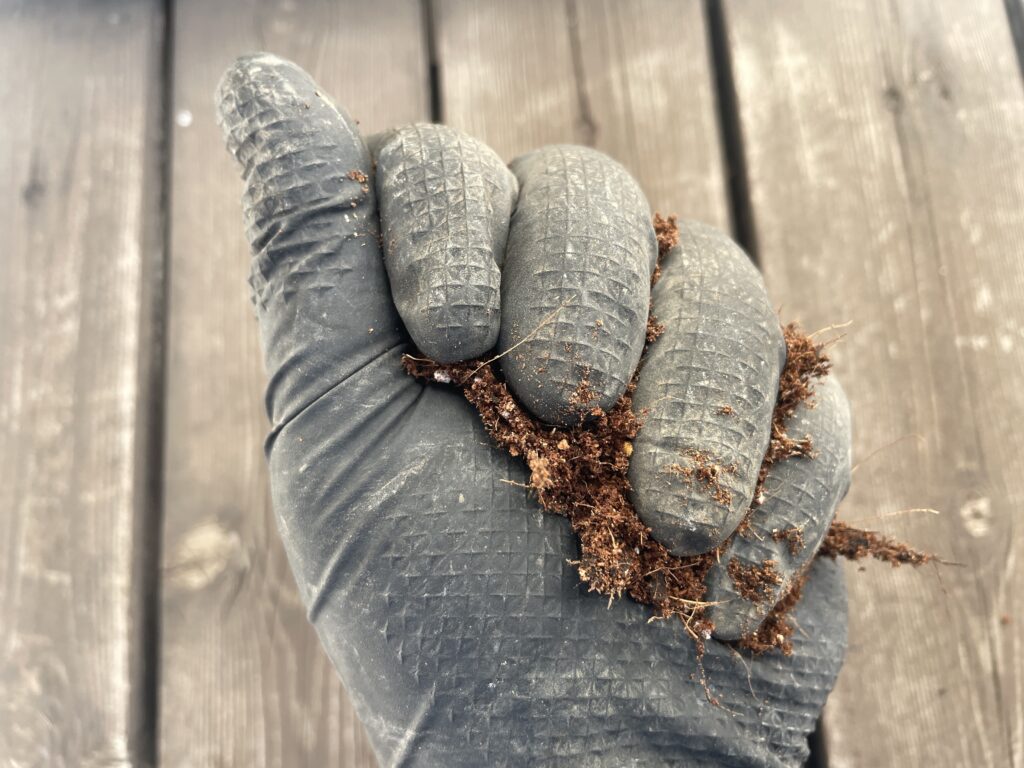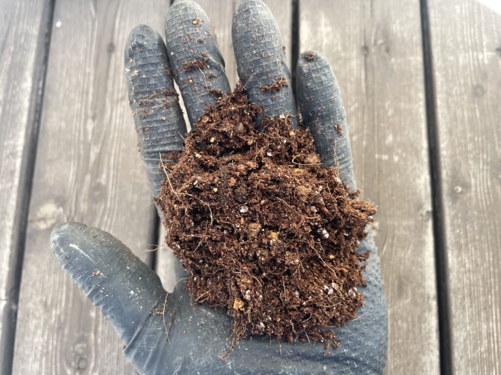 まだ固い石のような状態ですね。乾燥させてリサイクル材を混ぜるとフカフカの土に復活するんでしょうか?