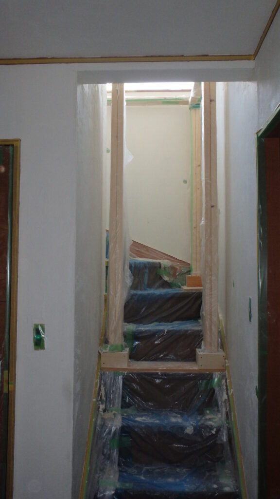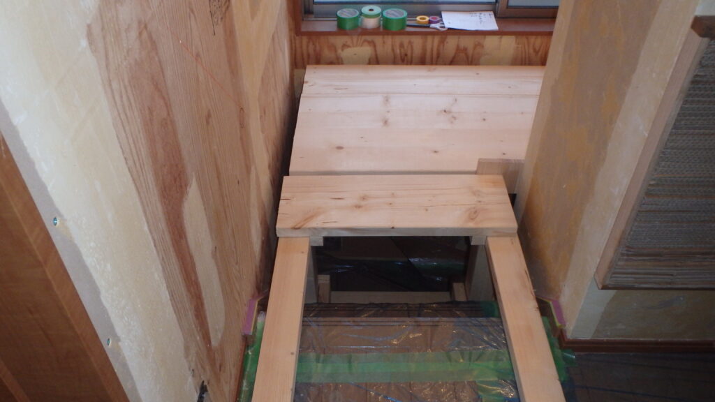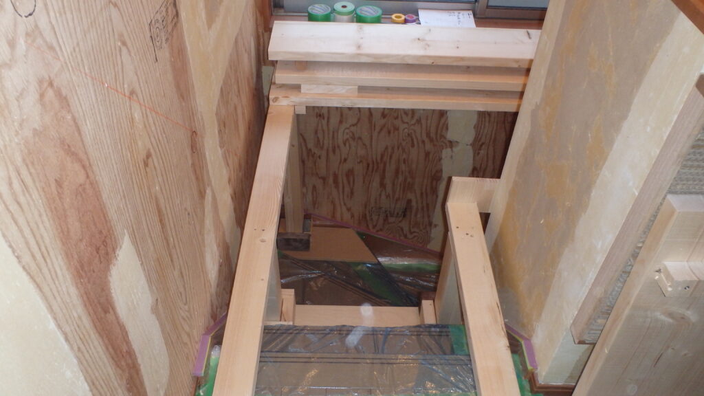 最初に階段をしっかり養生してから2×4材と2×6材を使って足場を組み立て。作業中も階段は使うので取り外せるようにしました。ウッドデッキを製作したときの経験を活かせたかな。