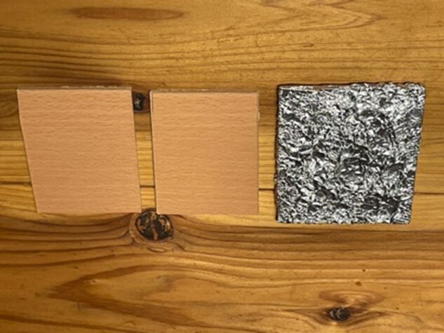 何もしていない板と、海のキラキラ表現できるかアルミホイルを巻いた板に、モデリングウォーターを注入してみる。