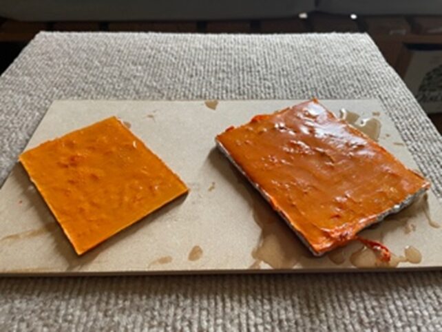 2回目の着色はアクリル塗料のオレンジに、アクリル絵の具の黒を数滴混ぜてみた。タイトルバックの色に近づいたか?!