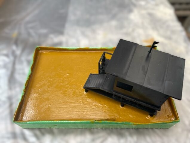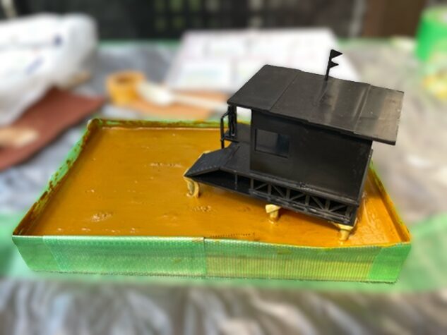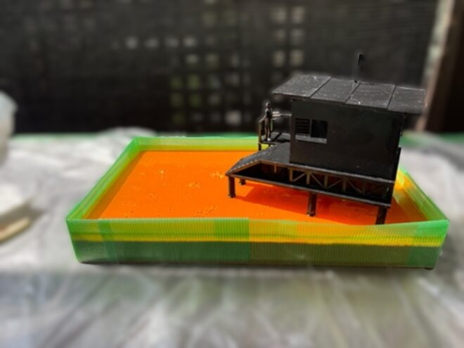 モデリングウォーターが漏れないように堤防作っていざ注入。完全に硬化してから着色。これから重ねていくから最初はこんなもんか?