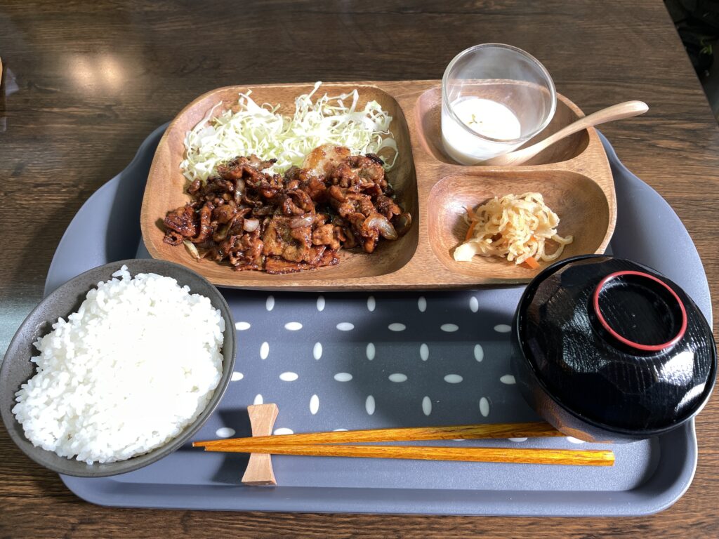 まず木の器が良いですね。生姜焼きは香ばしく切り干し大根も甘すぎなくてもちろん美味しいんですが、